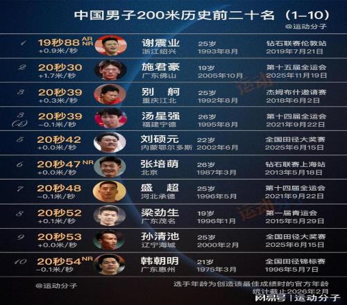 谢震业断档领衔,盘点中国男子200米历史最快20人