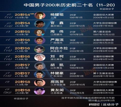 新中国男子200米的国家纪录,手计时代出现过刘敬仁、陈家全、林民伋、余维立、蔡建明、罗旭明等上古大神;电计...